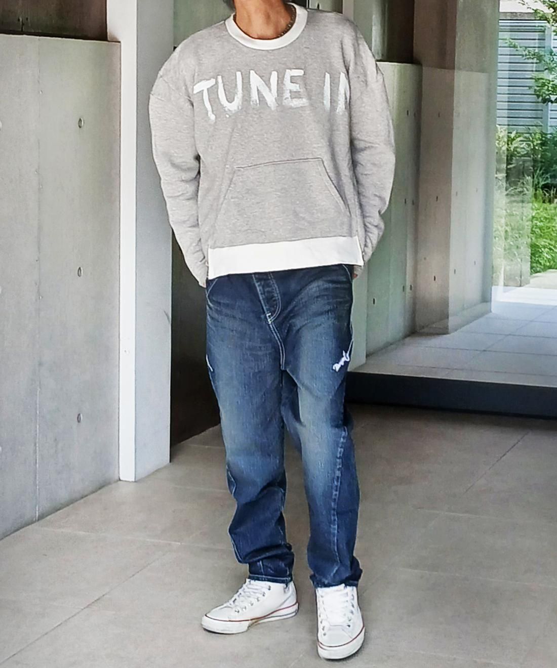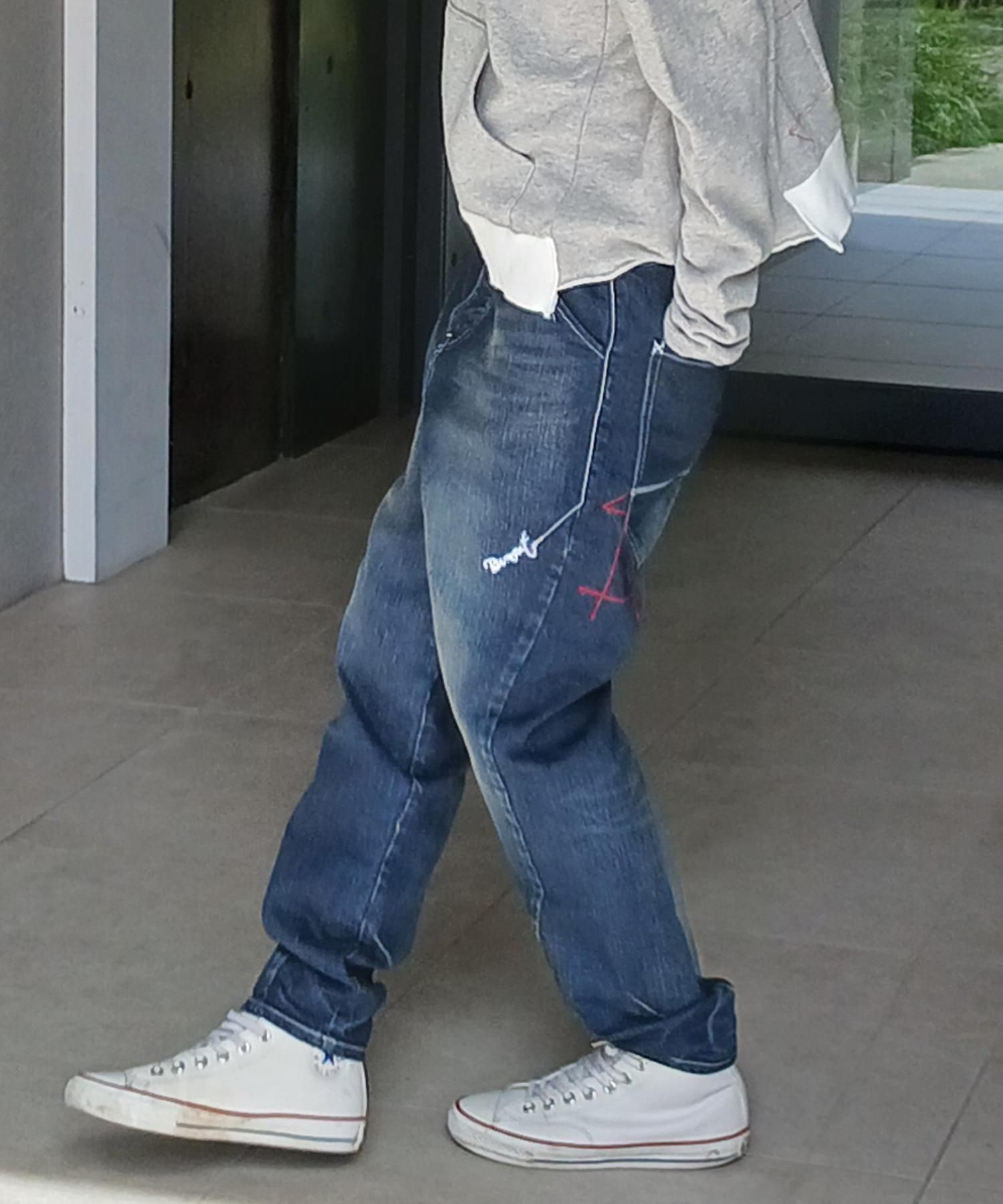 “ツイスト” 感を演出しました。サイドステッチから続くブランドロゴ刺繡がデニムをよりスタイリッシュでポップな雰囲気にさせるポイント。